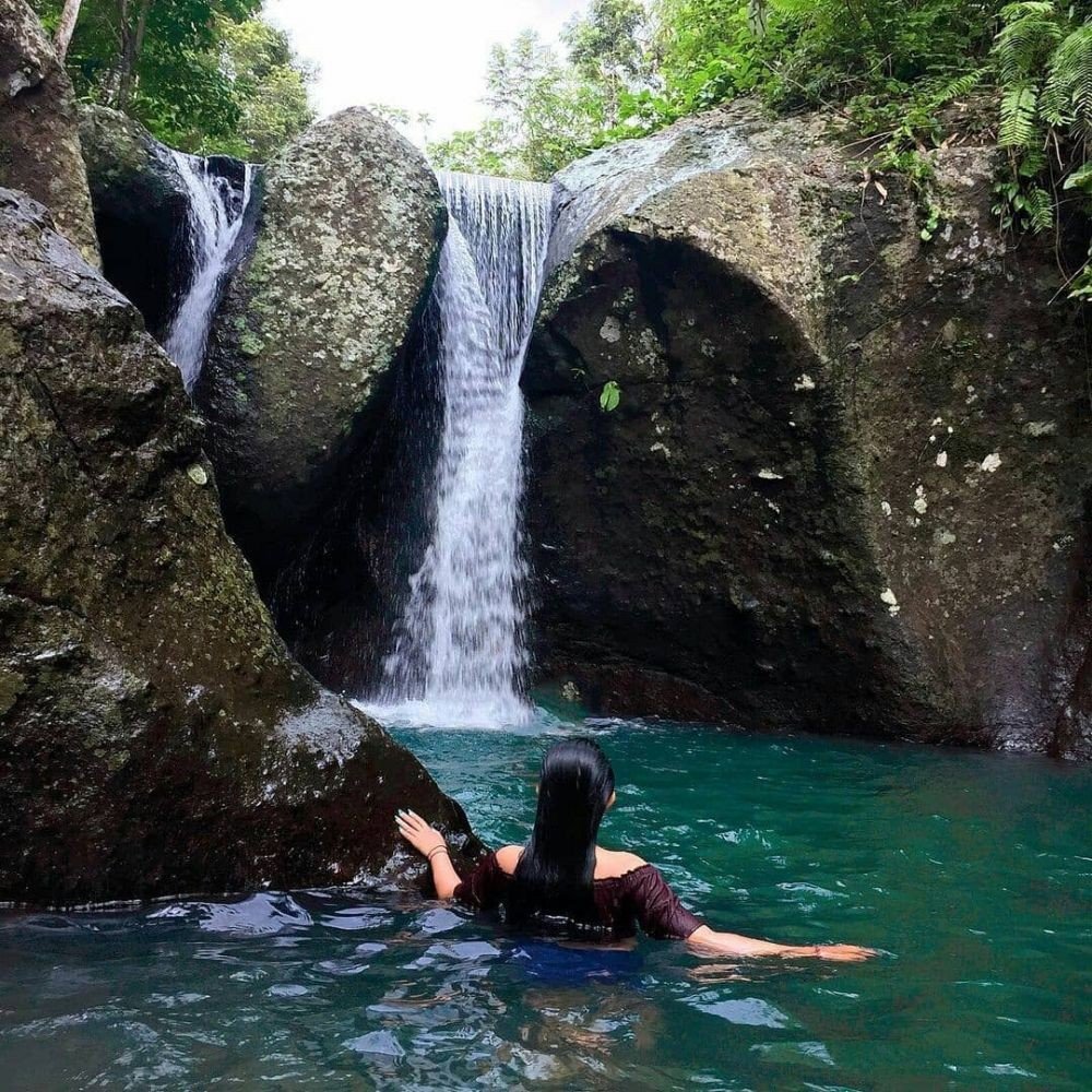Air terjun ini tersembunyi di antara dua batu besar yang terbelah. Airnya jernih dan segar, dan suasananya masih asri dan alami.