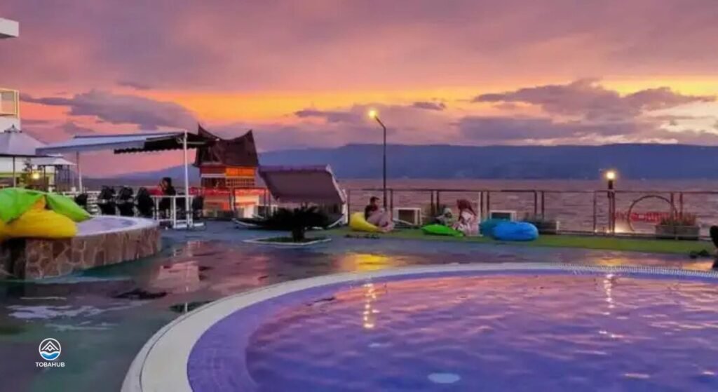Kolam renang outdoor dengan view Danau Toba