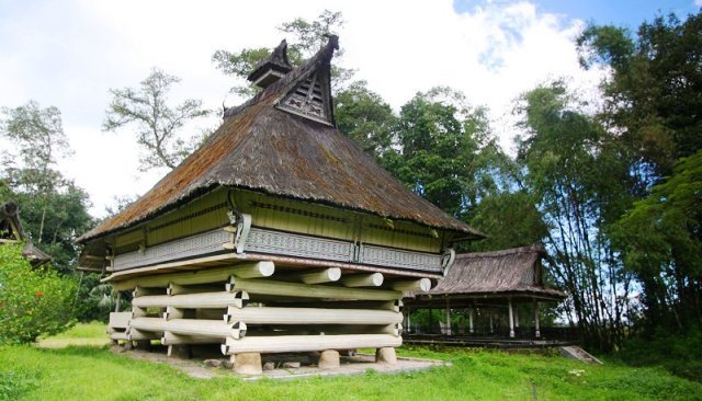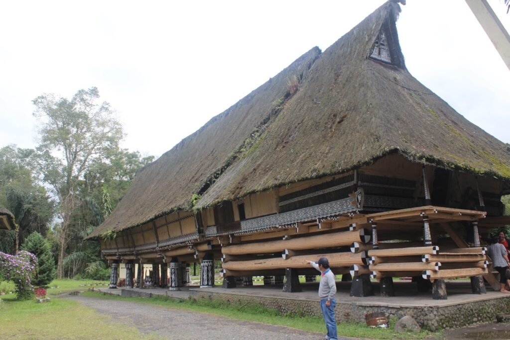 - Struktur Panggung dan Filosofi: Bangunan berbentuk rumah panggung yang tinggi, ditopang oleh tiang-tiang kayu besar. Desain ini tidak hanya berfungsi untuk menghindari binatang buas dan banjir, tetapi juga sarat akan filosofi kosmologi Batak.